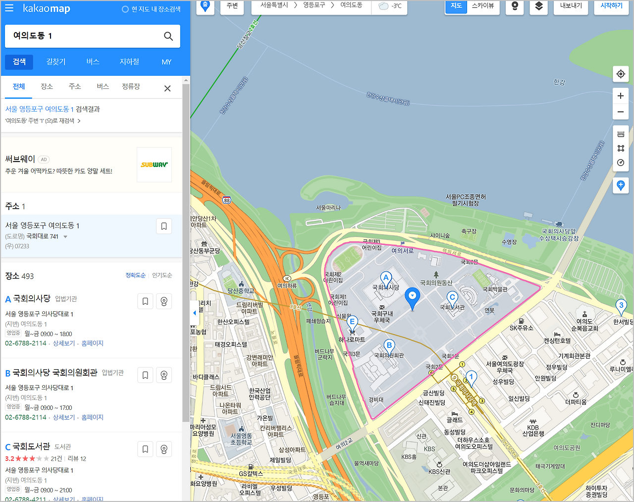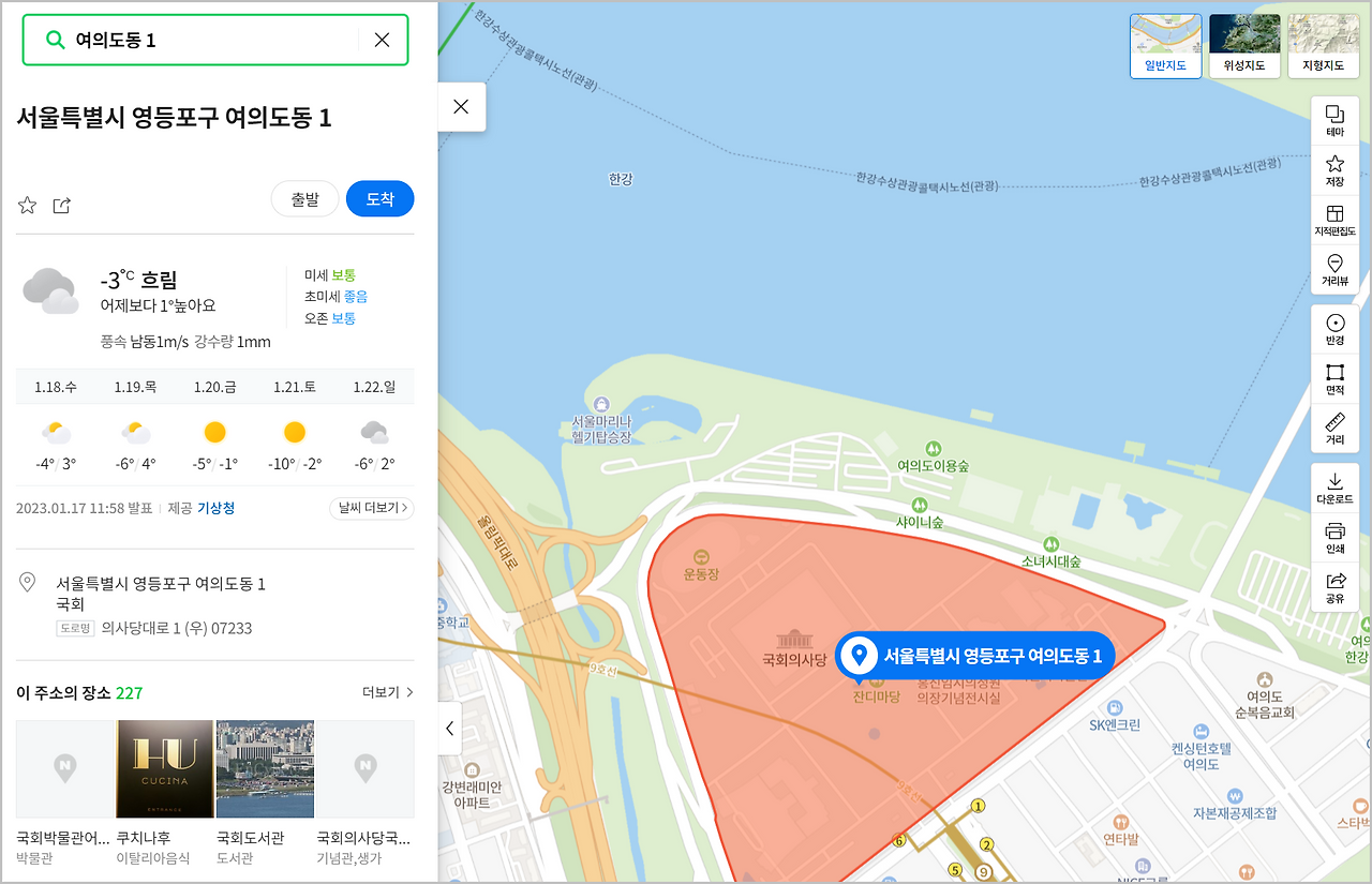 카카오맵에서는 지번 전체를 입력해도 되고, 간단하게 동 이름과 번지수만 입력해도 검색이 가능합니다. 예를 들어, 국회의 위치를 검색할 때 '여의도동 1' 정도만 입력해도 관련 장소를 찾아볼 수 있습니다. 결과는 지도로 바로 확인할 수 있어 위치 파악이 쉬워집니다.