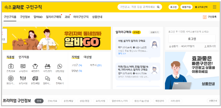 속초 교차로 구인구직에 접속하면 다음과 같은 화면을 확인할 수 있습니다. 고성군과 양양군의 구인구직 정보도 함께 확인할 수 있습니다.