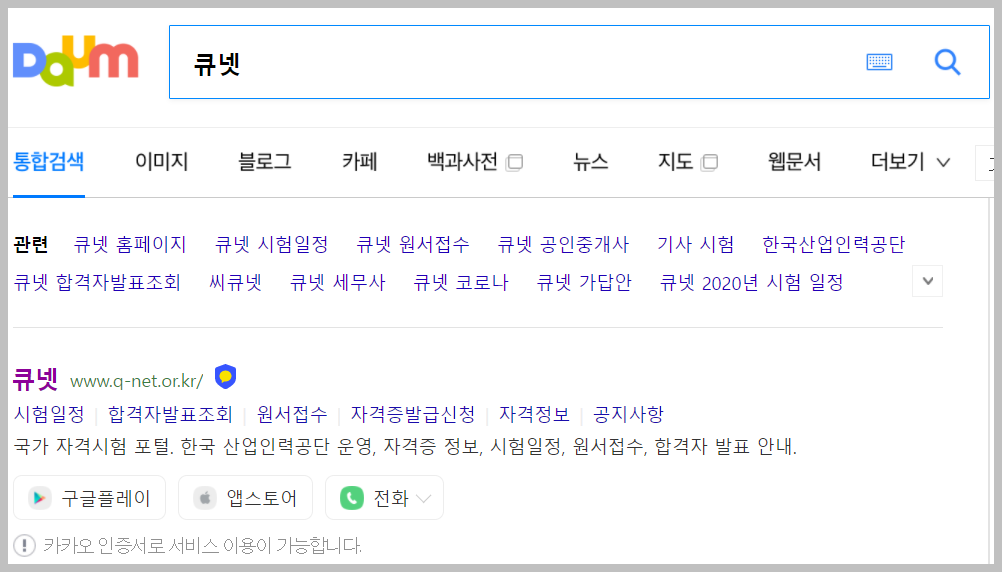 다음에서 '큐넷'이라고 간단히 검색하면 위와 같은 결과가 나옵니다. 'qnet'이나 'q-net' 등의 다양한 검색어로도 해당 웹사이트에 접속할 수 있습니다.